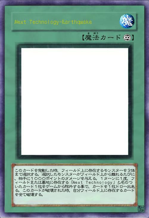 | このカードを発動した時、フィールド上に存在するモンスターを3体まで選択する。選択したモンスターがフィールド上から離れるたびに、相手に1000ポイントのダメージを与える。1ターンに1度、フィールドまたは墓地に存在する「Next Technology」と名のついたカード1枚をゲームから除外する事で、カードを1枚ドロー出来る。このカードが破壊された時、自分フィールド上に存在するカードを全て破壊する。 | |||