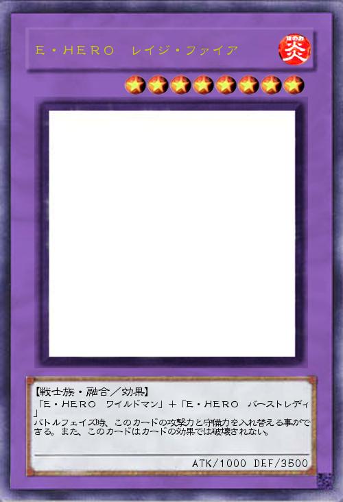 「E・HERO ワイルドマン」+「E・HERO バーストレディ」 バトルフェイズ時、このカードの攻撃力と守備力を入れ替える事ができる。また、このカードはカードの効果では破壊されない。 |