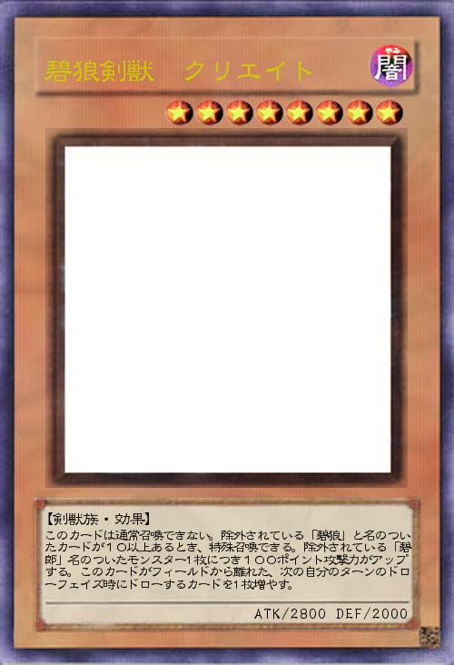 | このカードは通常召喚できない。除外されている「碧狼」と名のついたカードが10以上あるとき、特殊召喚できる。除外されている「碧郎」名のついたモンスター1枚につき100ポイント攻撃力がアップする。このカードがフィールドから離れた、次の自分のターンのドローフェイズ時にドローするカードを1枚増やす。 | |||