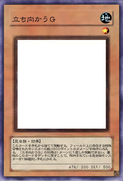 | このカードを手札から捨てて発動する。フィールド上に存在する特殊召喚されたモンスターの数×800ポイントのダメージを相手に与える。「立ち向かうG」の効果は1ターンに1度しか発動できない。墓地のこのカードをデッキに戻すことで、除外されている昆虫族モンスターを1体選択し手札に加える。 | |||