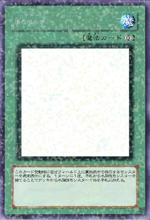 | このカード発動時に自分フィールド上に裏側表示で存在するモンスターを表側表示にする。1ターンに1度、手札から水属性モンスターを捨てることでデッキから水属性モンスター1体を手札に加える。 | |||