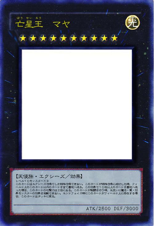 レベル10モンスター×3 このカードはエクシーズ召喚でしか特殊召喚できない。このカードが特殊召喚に成功した時、フィールド上のこのカード以外のカードを全て墓地へ送る。この効果で10枚以上のカードを墓地へ送った場合、このカードの攻撃力は2倍になる。このカードが戦闘を行う時、お互いに魔法・罠・効果モンスターの効果を発動できない。エンドフェイズ時にこのカードがフィールド上に存在する場合、このカードはデッキに戻る。 |