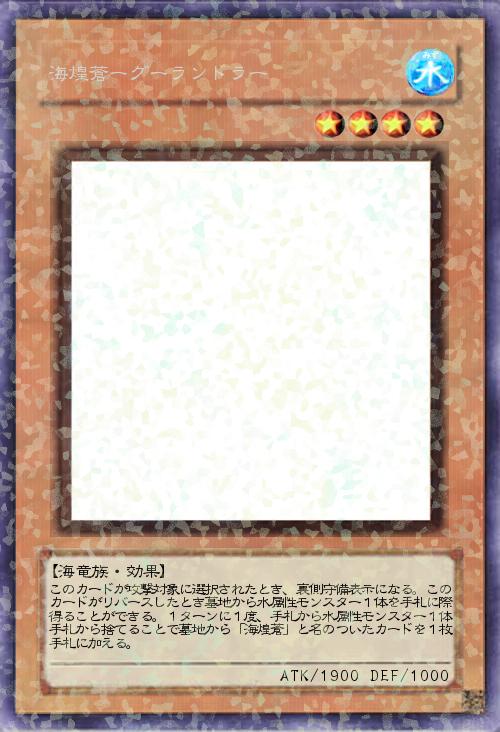 | このカードが攻撃対象に選択されたとき、裏側守備表示になる。このカードがリバースしたとき墓地から水属性モンスター1体を手札に際得ることができる。1ターンに1度、手札から水属性モンスター1体手札から捨てることで墓地から「海煌蒼」と名のついたカードを1枚手札に加える。 | |||