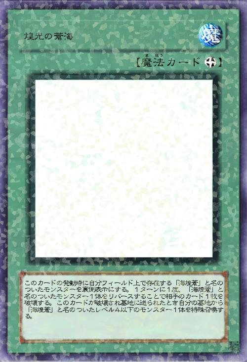 | このカードの発動時に自分フィールド上で存在する「海煌蒼」と名のついたモンスターを裏側表示にする。1ターンに1度、「海煌蒼」と名のついたモンスター1体をリバースすることで相手のカード1枚を破壊する。このカードが破壊され墓地に送られたとき自分の墓地から「海煌蒼」と名のついたレベル4以下のモンスター1体を特殊召喚する。 | |||