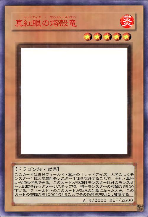 | このカードは自分フィールド・墓地の「レッドアイズ」と名のつくモンスター1体と炎属性モンスター1体を除外することで、手札・墓地から特殊召喚できる。このカードが炎属性モンスター以外のモンスターと戦闘を行うダメージステップ時、相手モンスターの攻撃力を500下げる。フィールド上のこのカードが効果の対象になったとき、このカードの守備力を1000下げることでその効果を無効にし破壊する。 | |||