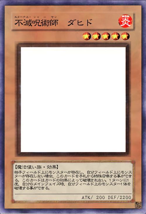 | 相手フィールド上にモンスターが存在し、自分フィールド上にモンスターが存在しない場合、このカードを手札から特殊召喚する事ができる。このカードはカードの効果によって破壊されない。1ターンに1度、自分のメインフェイズ時、自分フィールド上のモンスター1体を破壊する事ができる。 | |||