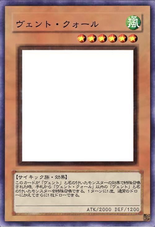 | このカードが「ヴェント」と名の付いたモンスターの効果で特殊召喚された時、手札から「ヴェント・クォール」以外の「ヴェント」と名の付いたモンスターを特殊召喚できる。1ターンに1度、通常のドローに加えてさらに1枚ドローできる。 | |||