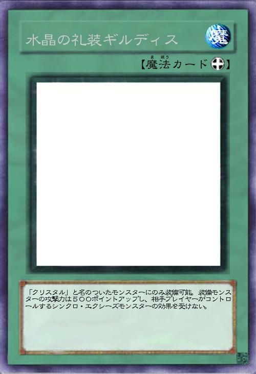 | 「クリスタル」と名のついたモンスターにのみ装備可能。装備モンスターの攻撃力は500ポイントアップし、相手プレイヤーがコントロールするシンクロ・エクシーズモンスターの効果を受けない。 | |||