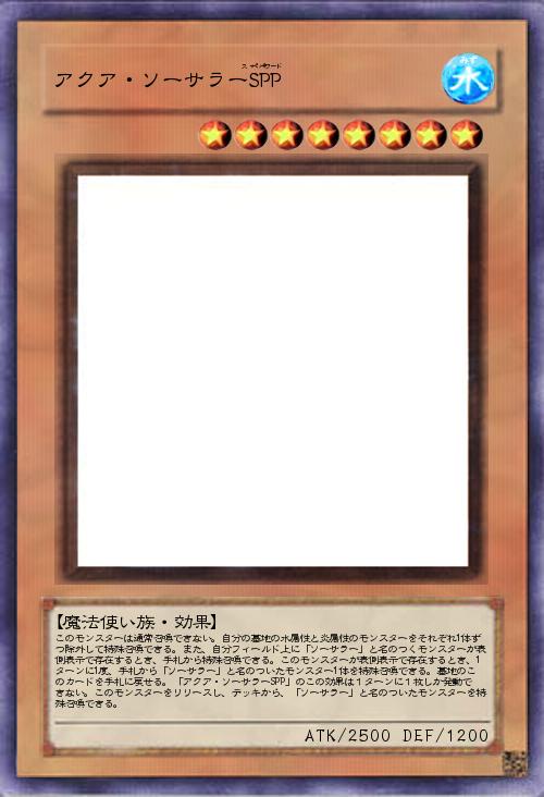 | このモンスターは通常召喚できない。自分の墓地の水属性と炎属性のモンスターをそれぞれ1体ずつ除外して特殊召喚できる。また、自分フィールド上に「ソーサラー」と名のつくモンスターが表側表示で存在するとき、手札から特殊召喚できる。このモンスターが表側表示で存在するとき、1ターンに1度、手札から「ソーサラー」と名のついたモンスター1体を特殊召喚できる。墓地のこのカードを手札に戻せる。「アクア・ソーサラーSPP」のこの効果は1ターンに1枚しか発動できない。このモンスターをリリースし、デッキから、「ソーサラー」と名のついたモンスターを特殊召喚できる。 | |||