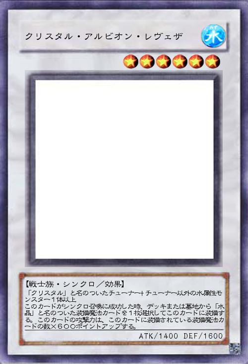 「クリスタル」と名のついたチューナー+チューナー以外の水属性モンスター1体以上 このカードがシンクロ召喚に成功した時、デッキまたは墓地から「水晶」と名のついた装備魔法カードを1枚選択してこのカードに装備する。このカードの攻撃力は、このカードに装備されている装備魔法カードの数×600ポイントアップする。 |