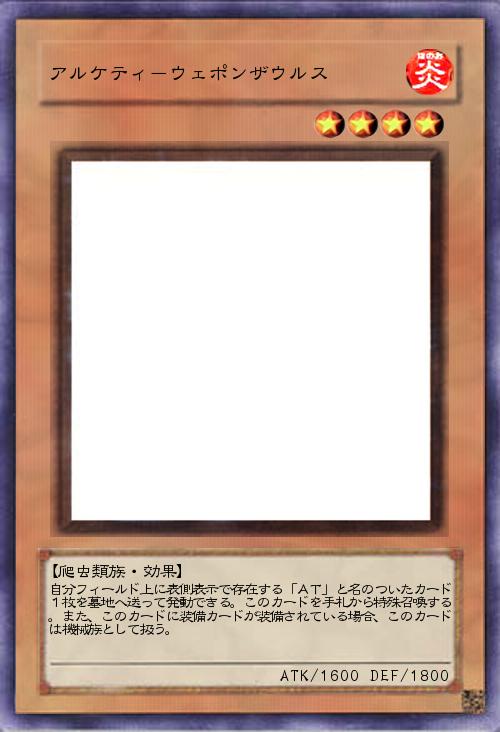 | 自分フィールド上に表側表示で存在する「AT」と名のついたカード1枚を墓地へ送って発動できる。このカードを手札から特殊召喚する。また、このカードに装備カードが装備されている場合、このカードは機械族として扱う。 | |||