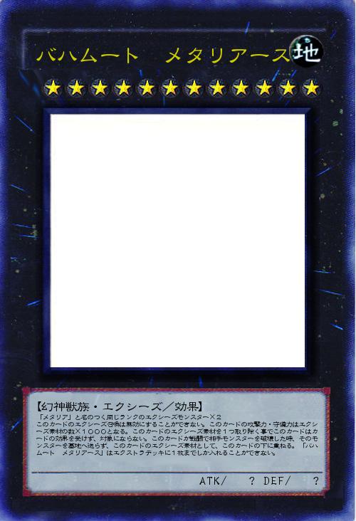 「メタリア」と名のつく同じランクのエクシーズモンスター×2 このカードのエクシーズ召喚は無効にすることができない。このカードの攻撃力・守備力はエクシーズ素材の数×1000となる。このカードのエクシーズ素材を1つ取り除く事でこのカードはカードの効果を受けず、対象にならない。このカードが戦闘で相手モンスターを破壊した時、そのモンスターを墓地へ送らず、このカードのエクシーズ素材として、このカードの下に重ねる。「バハムート メタリアース」はエクストラデッキに1枚までしか入れることができない。 |