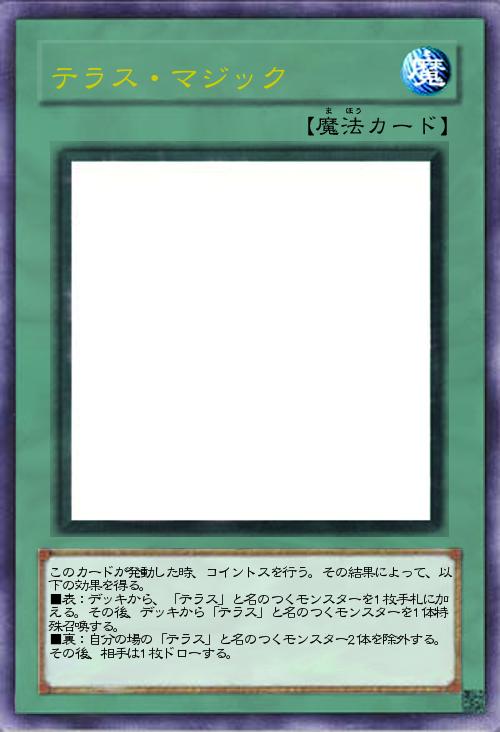 このカードが発動した時、コイントスを行う。その結果によって、以下の効果を得る。 ■表:デッキから、「テラス」と名のつくモンスターを1枚手札に加える。その後、デッキから「テラス」と名のつくモンスターを1体特殊召喚する。 ■裏:自分の場の「テラス」と名のつくモンスター2体を除外する。その後、相手は1枚ドローする。 |