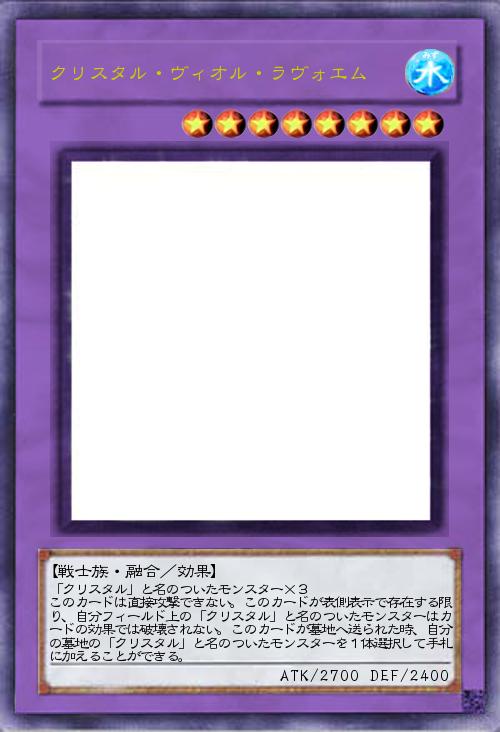 「クリスタル」と名のついたモンスター×3 このカードは直接攻撃できない。このカードが表側表示で存在する限り、自分フィールド上の「クリスタル」と名のついたモンスターはカードの効果では破壊されない。このカードが墓地へ送られた時、自分の墓地の「クリスタル」と名のついたモンスターを1体選択して手札に加えることができる。 |