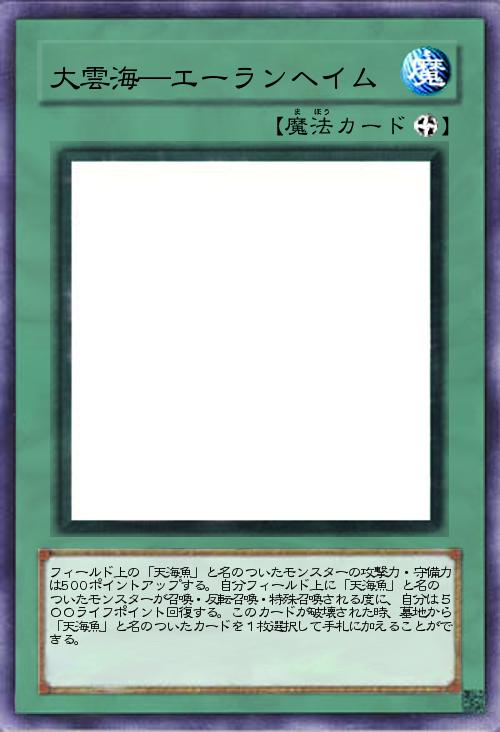 | フィールド上の「天海魚」と名のついたモンスターの攻撃力・守備力は500ポイントアップする。自分フィールド上に「天海魚」と名のついたモンスターが召喚・反転召喚・特殊召喚される度に、自分は500ライフポイント回復する。このカードが破壊された時、墓地から「天海魚」と名のついたカードを1枚選択して手札に加えることができる。 | |||