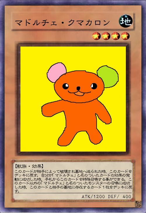 | このカードが相手によって破壊され墓地へ送られた時、このカードをデッキに戻す。自分が「マドルチェ」と名のついたカードの効果の発動に成功した時、手札からこのカードを特殊召喚する事ができる。このカード以外の「マドルチェ」と名のついたモンスターの召喚に成功した時、このカードと相手の墓地に存在するカード1枚をデッキに戻す。 | |||