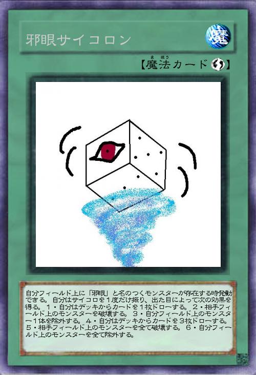 | 自分フィールド上に「邪眼」と名のつくモンスターが存在する時発動できる。自分はサイコロを1度だけ振り、出た目によって次の効果を得る。1・自分はデッキからカードを1枚ドローする。2・相手フィールド上のモンスターを破壊する。3・自分フィールド上のモンスター1体を除外する。4・自分はデッキからカードを3枚ドローする。5・相手フィールド上のモンスターを全て破壊する。6・自分フィールド上のモンスターを全て除外する。 | |||