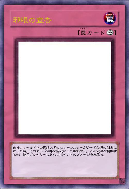 | 自分フィールド上の邪眼と名のつくモンスターがカード効果の対象になった時、そのカード効果を無効にして除外する。この効果が発動する時、相手プレイヤーに500ポイントのダメージを与える。 | |||