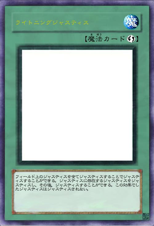 「フィールド上のジャスティスと名のつくモンスターをすべて破壊することで発動できる。相手フィールド上に存在する魔法・罠カードを全て破壊しその後、手札のジャスティスと名のつくモンスターをこのカードの発動時に破壊したカードの数まで特殊召喚する。この効果で特殊召喚したモンスターの召喚は無効にされない。