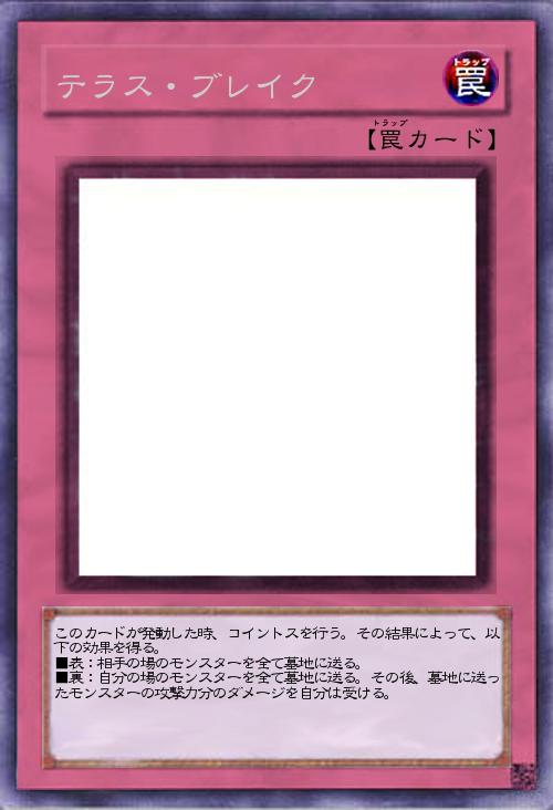 このカードが発動した時、コイントスを行う。その結果によって、以下の効果を得る。 ■表:相手の場のモンスターを全て墓地に送る。 ■裏:自分の場のモンスターを全て墓地に送る。その後、墓地に送ったモンスターの攻撃力分のダメージを自分は受ける。 |