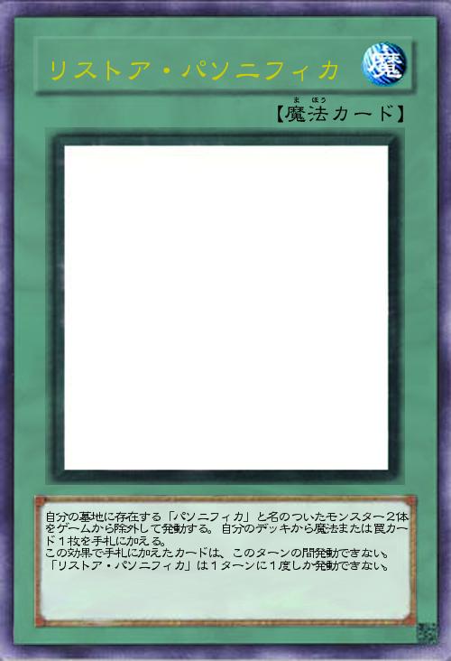 自分の墓地に存在する「パソニフィカ」と名のついたモンスター2体をゲームから除外して発動する。自分のデッキから魔法または罠カード1枚を手札に加える。 この効果で手札に加えたカードは、このターンの間発動できない。 「リストア・パソニフィカ」は1ターンに1度しか発動できない。 |