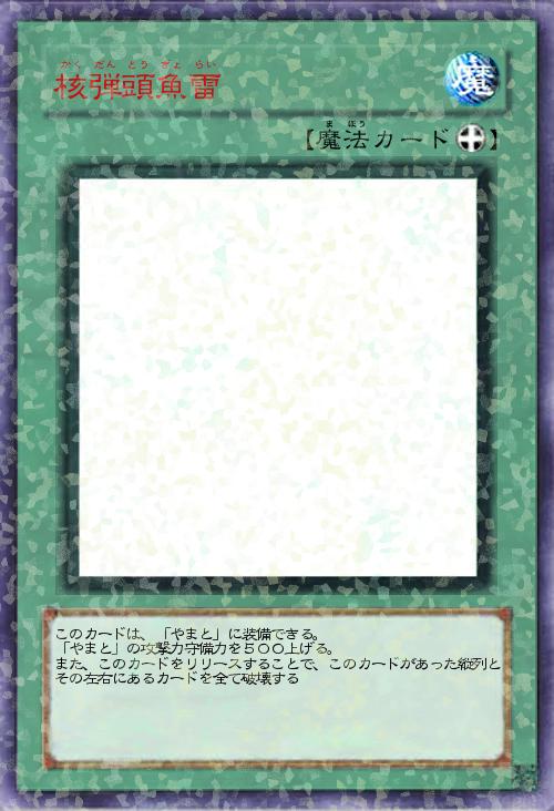 このカードは、「やまと」に装備できる。 「やまと」の攻撃力守備力を500上げる。 また、このカードをリリースすることで、このカードがあった縦列とその左右にあるカードを全て破壊する |