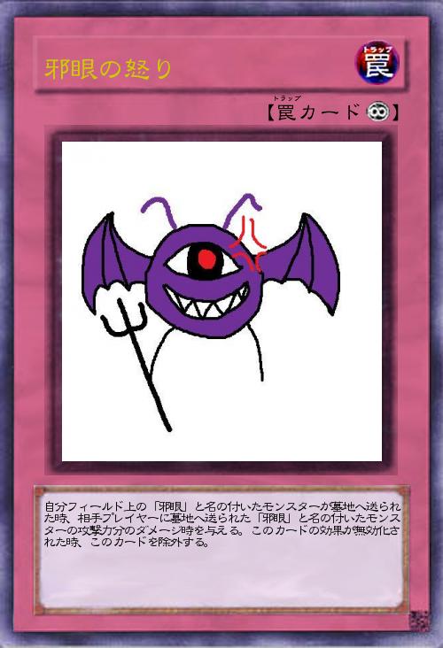 | 自分フィールド上の「邪眼」と名の付いたモンスターが墓地へ送られた時、相手プレイヤーに墓地へ送られた「邪眼」と名の付いたモンスターの攻撃力分のダメージ時を与える。このカードの効果が無効化された時、このカードを除外する。 | |||