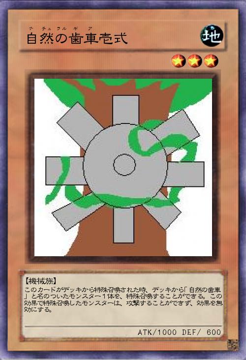 | このカードがデッキから特殊召喚された時、デッキから「自然の歯車」と名のついたモンスター1体を、特殊召喚することができる。この効果で特殊召喚したモンスターは、攻撃することができず、効果を無効にする。 | |||