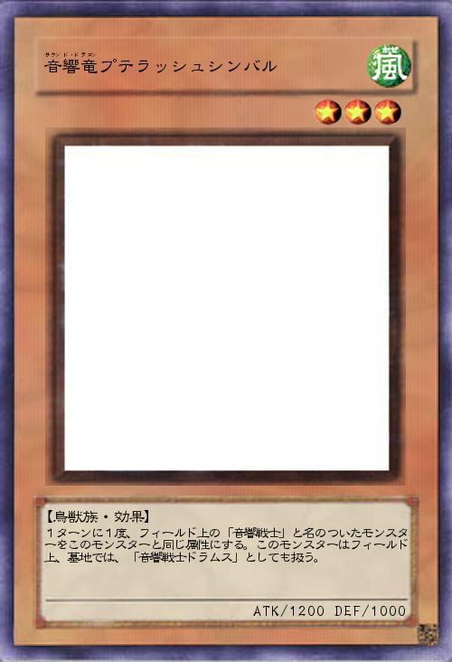 「「スプラッシュシンバル」と「プテラノドン」をかけたモンスター。ドラムスの効果で属性を変えると、音響戦士の属性も変わる。」(2013-01-16 22:26)