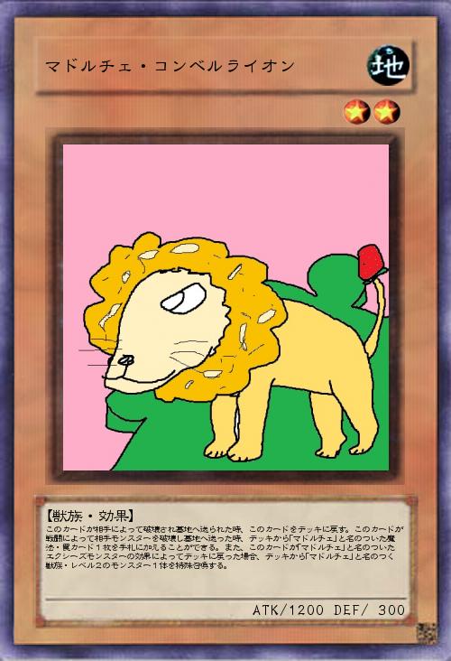 「単体では戦闘破壊限定の効果だが、魔法・罠をサーチできるのは嬉しい1枚。第2の効果は、私が制作した「ボルドーウサギ」や「パスカリス」を特殊召喚できる。また、デッキへ戻った場合の高価なので、「ティアラミス」とも相性がよく、このカード自身も特殊召喚できます。あと、絵が下手でもマドルチェはイラスト命なので、これからもガンバります。><」(2013-01-18 18:42)