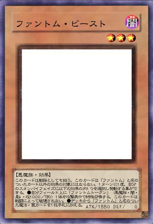 | このカードは獣族としても扱う。このカードは「ファントム」と名のついたカード以外の効果の対象にはならない。1ターンに1度、自分のスタンバイフェイズに以下の効果の内1つを選択し発動する事ができる。●自分フィールド上に「ファントムトークン」(悪魔族・闇・星4・攻1000/守0)1体を攻撃表示で特殊召喚する。このカードは戦闘によって破壊されない。●デッキから「ファントム」と名のついた魔法・罠カードを1枚手札に加える。 | |||