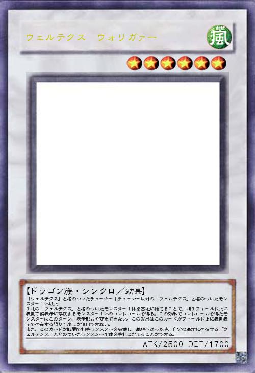 「ウェルテクス」と名のついたチューナー+チューナー以外の「ウェルテクス」と名のついたモンスター1体以上 手札の「ウェルテクス」と名のついたモンスター1体を墓地に捨てることで、相手フィールド上に表側守備表示に存在するモンスター1体のコントロールを得る。この効果でコントロールを得たモンスターはこのターン、表示形式を変更できない。この効果はこのカードがフィールド上に表側表示で存在する限り1度しか使用できない。 また、このカードが戦闘で相手モンスターを破壊し、墓地へ送った時、自分の墓地に存在する「ウェルテクス」と名のついたモンスター1体を手札に加えることができる。 |