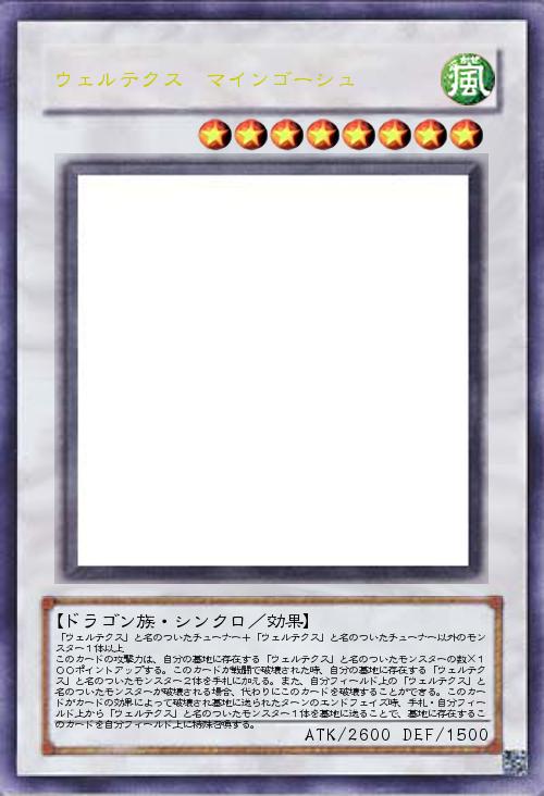 「ウェルテクス」と名のついたチューナー+「ウェルテクス」と名のついたチューナー以外のモンスター1体以上 このカードの攻撃力は、自分の墓地に存在する「ウェルテクス」と名のついたモンスターの数×100ポイントアップする。このカードが戦闘で破壊された時、自分の墓地に存在する「ウェルテクス」と名のついたモンスター2体を手札に加える。また、自分フィールド上の「ウェルテクス」と名のついたモンスターが破壊される場合、代わりにこのカードを破壊することができる。このカードがカードの効果によって破壊され墓地に送られたターンのエンドフェイズ時、手札・自分フィールド上から「ウェルテクス」と名のついたモンスター1体を墓地に送ることで、墓地に存在するこのカードを自分フィールド上に特殊召喚する。 |