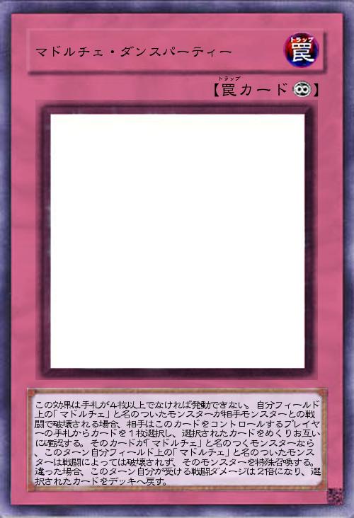 | この効果は手札が4枚以上でなければ発動できない。自分フィールド上の「マドルチェ」と名のついたモンスターが相手モンスターとの戦闘で破壊される場合、相手はこのカードをコントロールするプレイヤーの手札からカードを1枚選択し、選択されたカードをめくりお互いに確認する。そのカードが「マドルチェ」と名のつくモンスターなら、このターン自分フィールド上の「マドルチェ」と名のついたモンスターは戦闘によっては破壊されず、そのモンスターを特殊召喚する。違った場合、このターン自分が受ける戦闘ダメージは2倍になり、選択されたカードをデッキへ戻す。 | |||