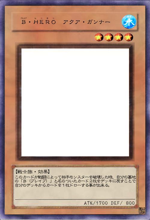 「え~、B(ブレイブ)カテゴリ第4弾は水の銃使いさんです。この銃使いさんは戦闘破壊した時にB(ブレイブ)カテゴリのカードを2枚デッキに戻せば、カードを1枚引けます。戦闘破壊の方は条件をきつくした代わりに、墓地から戻すカードの制限をカテゴリだけにしたり、準アタッカークラスの攻撃力を持たせてあげました。モンスターだけなら墓地アドを失うのが痛いですが、魔法・罠ならそこまででもない場合もあるかな~と・・・まあ、墓地利用カードを作りだしたら、それらとは少し噛み合わなくなるかもしれないです・・・「戦闘によって」なので一応相手の攻撃喰らった時にも発動は・・・できます・・・