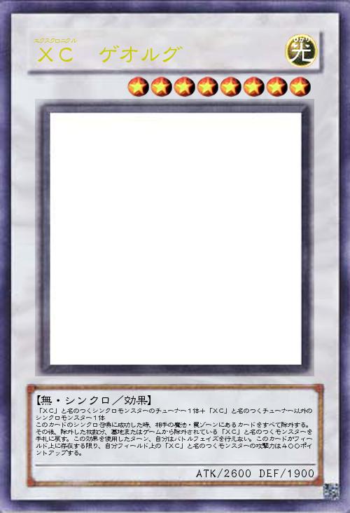 「XC」と名のつくシンクロモンスターのチューナー1体+「XC」と名のつくチューナー以外のシンクロモンスター1体 このカードのシンクロ召喚に成功した時、相手の魔法・罠ゾーンにあるカードをすべて除外する。その後、除外した枚数分、墓地またはゲームから除外されている「XC」と名のつくモンスターを手札に戻す。この効果を使用したターン、自分はバトルフェイズを行えない。このカードがフィールド上に存在する限り、自分フィールド上の「XC」と名のつくモンスターの攻撃力は400ポイントアップする。 |