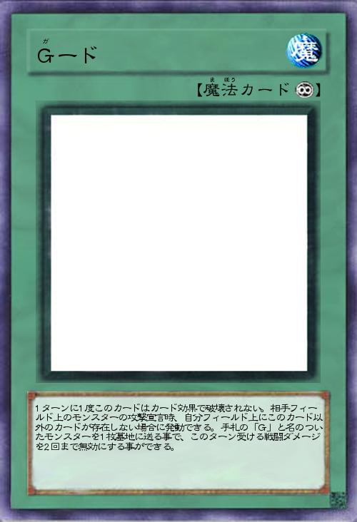 | 1ターンに1度このカードはカード効果で破壊されない。相手フィールド上のモンスターの攻撃宣言時、自分フィールド上にこのカード以外のカードが存在しない場合に発動できる。手札の「G」と名のついたモンスターを1枚墓地に送る事で、このターン受ける戦闘ダメージを2回まで無効にする事ができる。 | |||