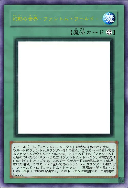 | フィールド上に「ファントム・トークン」が特殊召喚される度に、このカードにファントムカウンターを1つ置く。このカードに置いてあるファントムカウンター1つにつき、フィールド上の「ファントム」と名のついたモンスターまたは「ファントム・トークン」の攻撃力は100ポイントアップする。このカードがカードの効果によって破壊された場合、このカードに置いてあるファントムカウンターの数だけ、フィールド上に「ファントム・トークン」(悪魔族・闇・星4・攻1000/守0)を特殊召喚する。このトークンは戦闘によって破壊されない。 | |||