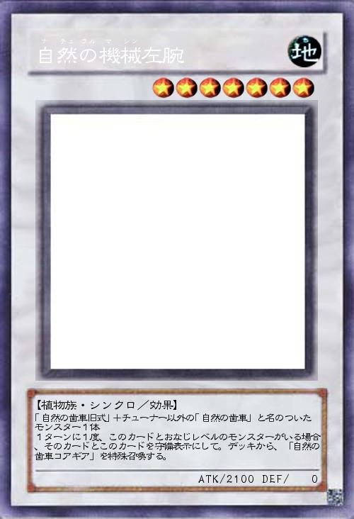 「自然の歯車旧式」+チューナー以外の「自然の歯車」と名のついたモンスター1体 1ターンに1度、このカードとおなじレベルのモンスターがいる場合、そのカードとこのカードを守備表示にして。デッキから、「自然の歯車コアギア」を特殊召喚する。 |