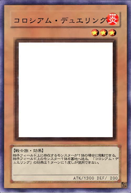 | 相手フィールド上に存在するモンスターが1体の場合に発動できる。相手フィールド上のモンスター1体を墓地へ送る。「コロシアム・デュエリング」の効果は1ターンに1度しか使用できない。 | |||