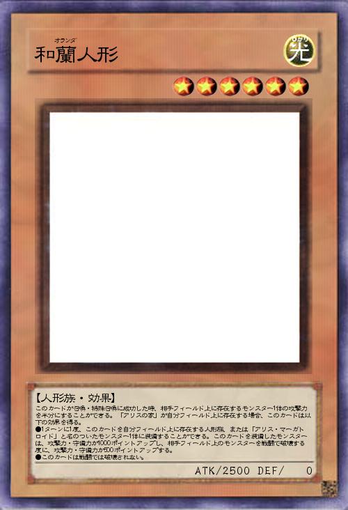 このカードが召喚・特殊召喚に成功した時、相手フィールド上に存在するモンスター1体の攻撃力を半分にすることができる。「アリスの家」が自分フィールド上に存在する場合、このカードは以下の効果を得る。 ●1ターンに1度、このカードを自分フィールド上に存在する人形族、または「アリス・マーガトロイド」と名のついたモンスター1体に装備することができる。このカードを装備したモンスターは、攻撃力・守備力が1000ポイントアップし、相手フィールド上のモンスターを戦闘で破壊する度に、攻撃力・守備力が500ポイントアップする。 ●このカードは戦闘では破壊されない。 |