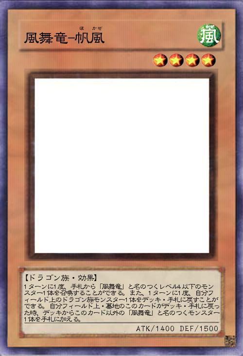 | 1ターンに1度、手札から「風舞竜」と名のつくレベル4以下のモンスター1体を召喚することができる。また、1ターンに1度、自分フィールド上のドラゴン族モンスター1体をデッキ・手札に戻すことができる。自分フィールド上・墓地のこのカードがデッキ・手札に戻った時、デッキからこのカード以外の「風舞竜」と名のつくモンスター1体を手札に加える。 | |||