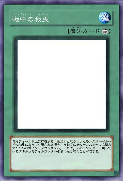 | 自分フィールド上に存在する「戦災」と名のついたモンスターがカードの効果によって破壊される場合、代わりにそのモンスターの攻撃力を1000ポイントダウンさせる。または、そのモンスターに乗っているグルカラミティカウンターを3つ取り除くことができる。 | |||
