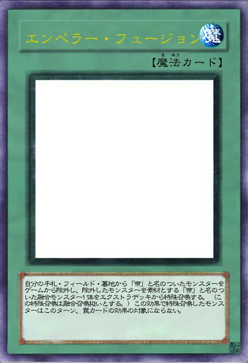 | 自分の手札・フィールド・墓地から「帝」と名のついたモンスターをゲームから除外し、除外したモンスターを素材とする「帝」と名のついた融合モンスター1体をエクストラデッキから特殊召喚する。(この特殊召喚は融合召喚扱いとする。)この効果で特殊召喚したモンスターはこのターン、罠カードの効果の対象にならない。 | |||
