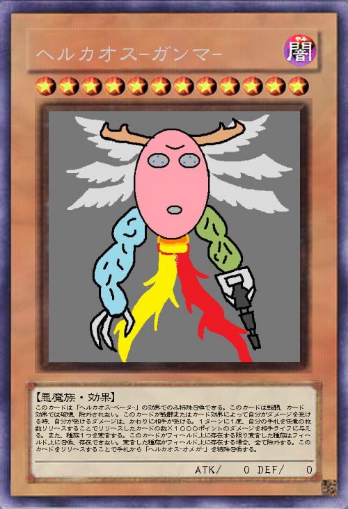 | このカードは「ヘルカオス-ベータ-」の効果でのみ特殊召喚できる。このカードは戦闘、カード効果では破壊、除外されない。このカードが戦闘またはカード効果によって自分がダメージを受ける時、自分が受けるダメージは、かわりに相手が受ける。1ターンに1度、自分の手札を任意の枚数リリースすることでリリースしたカードの数×1000ポイントのダメージを相手ライフに与える。また、種族1つを宣言する。このカードがフィールド上に存在する限り宣言した種族はフィールド上に召喚、存在できない。宣言した種族がフィールド上に存在する場合、全て除外する。このカードをリリースすることで手札から「ヘルカオス-オメガ-」を特殊召喚する。 | |||