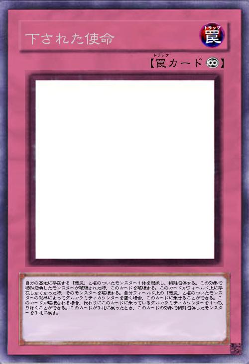 | 自分の墓地に存在する「戦災」と名のついたモンスター1体を選択し、特殊召喚する。この効果で特殊召喚したモンスターが破壊された時、このカードを破壊する。このカードがフィールド上に存在しなくなった時、そのモンスターを破壊する。自分フィールド上の「戦災」と名のついたモンスターの効果によってグルカラミティカウンターを置く場合、このカードに乗せることができる。このカードが破壊される場合、代わりにこのカードに乗っているグルカラミティカウンターを1つ取り除くことができる。このカードが手札に戻ったとき、このカードの効果で特殊召喚したモンスターを手札に戻す。 | |||