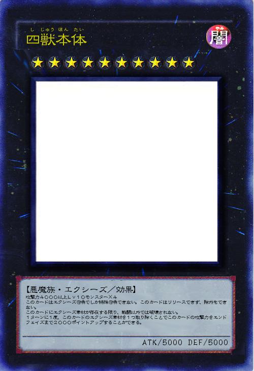攻撃力4000以上Lv10モンスター×4 このカードはエクシーズ召喚でしか特殊召喚できない。このカードはリリースできず、除外もできない。 このカードにエクシーズ素材が存在する限り、戦闘以外では破壊されない。 1ターンに1度、このカードのエクシーズ素材を1つ取り除くことでこのカードの攻撃力をエンドフェイズまで2000ポイントアップすることができる。 |