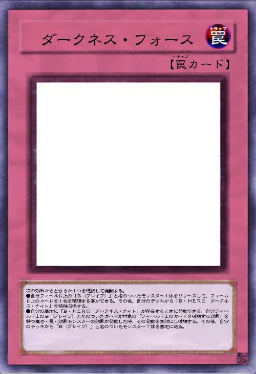 次の効果からどちらか1つを選択して発動する。 ●自分フィールド上の「B(ブレイブ)」と名のついたモンスター1体をリリースして、フィールド上のカードを1枚を破壊する事ができる。その後、自分のデッキから「B・HERO ダークネス・ナイト」を特殊召喚する。 ●自分の墓地に「B・HERO ダークネス・ナイト」が存在するときに発動できる。自分フィールド上のB(ブレイブ)と名のついたカードが対象の「フィールド上のカードを破壊する効果」を持つ魔法・罠・効果モンスターの効果が発動した時、その発動を無効にし破壊する。その後、自分のデッキから「B(ブレイブ)」と名のついたモンスター1体を墓地に送る。 |