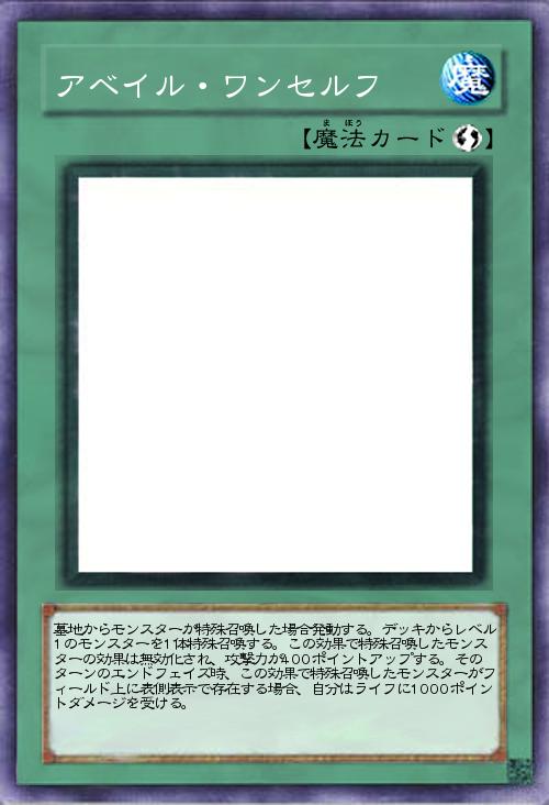 | 墓地からモンスターが特殊召喚した場合発動する。デッキからレベル1のモンスターを1体特殊召喚する。この効果で特殊召喚したモンスターの効果は無効化され、攻撃力が400ポイントアップする。そのターンのエンドフェイズ時、この効果で特殊召喚したモンスターがフィールド上に表側表示で存在する場合、自分はライフに1000ポイントダメージを受ける。 | |||