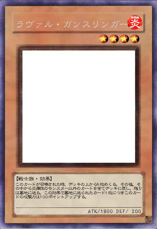 | このカードが召喚された時、デッキの上から5枚めくる。その後、その中から炎属性のモンスター以外のカードを全てデッキに戻し、残りは墓地に送る。この効果で墓地に送られたカード1枚につきこのカードの攻撃力は100ポイントアップする。 | |||